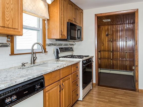 Great ranch with many upgrades!! Desirable gas heat to keep you toasty warm! 3rd bedroom currently used as dining room and can easily be converted back to a bedroom. This home has been lovingly maintained by same owners for over 30 years. Beautiful wood floors and crown molding throughout, remodeled eat-in kitchen with granite counters and full appliances with gas cooking. Large sunny living room with picture window and cozy den with relaxing gas brick fireplace. Mudroom between kitchen and garage with space for coats, shoes and storage. Enjoy the heated basement with finished family room, hardwood floors and possible extra bedroom. Sliding doors from kitchen and den lead to a roomy deck and flat fenced in back yard with loads of plants and flowers and a newer shed. Replacement windows, newer roof, central air and 2-car garage all in a great convenient location!