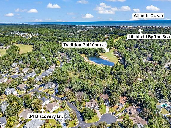 In search for the PERFECT move-in ready home that offers elegant, upscale and stylish renovations in Pawleys Island? Good News! Your search is over! Welcome to 34 Discovery Lane located in one of the most sought-after communities along the Grand Strand ~ the extremely popular Tradition Club Golf Course Community! This pristine 4-bedroom, 2.5-bath home has been extremely well-maintained and recently updated. Tucked perfectly on a quiet side street, combined with its enchanting curb appeal, the home is undoubtedly one of the most exceptional homes in the community offering a distinctively unique floor plan. This bright and cheerful home offers attractive LVP flooring throughout the main level except for the primary bath that has recently been updated with beautiful tile. The well-equipped kitchen offers quartzite countertops, tile backsplash, stainless steel appliances, custom cabinetry, pantry and spacious breakfast nook. The elegant dining room with tray ceiling, lovely crown molding and convenient dry bar are situated adjacent to the kitchen and easily accommodate family dinners and special events with accessible access to the formal living room – perfect for continued after dinner conversations. The family room is impressive with a soaring vaulted ceiling, decorative gas log fireplace showcased between impressive custom built-ins and a full wall lined with floor to ceiling windows providing lots of natural light to filter into the home. With open access to the kitchen, the family room is the perfect gathering place for family and friends. The primary bedroom suite has a tray ceiling and a ceiling fan, a generously sized walk-in closet with an attractive ensuite offering two vanities with quartzite countertops, a large glass, tiled shower and soaking tub. There are 3 spacious guest bedrooms located on the second floor along with a recently updated guest bath with dual sinks with quartzite countertops, tile flooring and a large, glass enclosed shower. There is also walk-out attic space that provides for additional storage needs. Additionally, this clever design also includes a room that currently serves as an art studio. Completing this impressive floor plan is a half bath, laundry room with full size washer/dryer and storage, 2 car attached garage, screened porch with new tile flooring, sizeable deck and newly added outside shower. The attractive Tradition Community offers exceptional amenities to its residents that include a community pool, clubhouse, tennis courts and sidewalks. Residents can also enjoy a short golf cart ride to the private ocean beach access at Litchfield by the Sea providing abundant parking, tennis courts, beach clubhouse, showers, restroom conveniences, sun decks, fishing/crabbing docks as well as miles of gorgeous ocean beach to explore & enjoy!