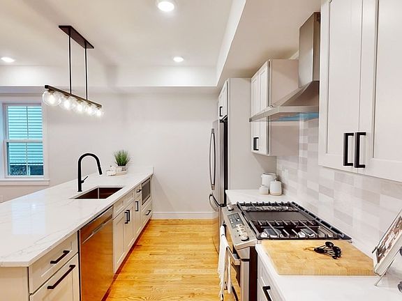 Top floor with tons of sunlight, this 3 bedroom 2 full bath condo with 1 parking spot included is located in the desirable Polish Triangle area of Dorchester, only mins to all of Boston and is NEW NEW NEW! This penthouse unit features a large open concept living room / dining area / kitchen with oversized peninsula, SS appliances, quartz counters and custom cabinetry. Down the hall is In-unit laundry, 3 equal sized bedrooms with great closet space, and 2 full baths. Hardwood floors, recessed lights and Custom colors throughout. Tankless Navien for unlimited hot showers, gas fired heat and central AC for hot summer days. Rear Deck out back basks in sun and fresh air. 5 mins to I-93 or a 10 min walk to Andrew Square MBTA. 12 Screen theater, 113,000sf of retail, coffee shops, grocery store, Home Depot, Target, etc. is only 3-4 blocks away. DJ's Deli, D-Bar & 224 Boston are all easy walkable dining options. **Landscaping and walkways will be completed in the Spring**