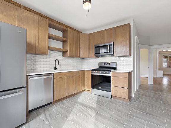 This beautifully updated, spacious, and sunny 2 bedroom + den apt with one full bathroom is ideally located near the 34th st light rail station for an easy commute to Downtown Jersey City, Hoboken, and NYC, and half a block from Broadway restaurants, stores, supermarkets, pharmacies, and bars. The gut-renovated kitchen features quartz counters, stainless-steel appliances, including a French-door fridge, dishwasher, gas oven/range, and built-in microwave with a vent, as well as new ceramic floor tiles. The 1,100 sq ft second-floor unit also features central heating and cooling along with some beautiful original architectural details. In addition to an expansive living and dining room combination, the freshly painted apt also features a huge walk-in closet off the stairwell and a front-facing sunroom for morning coffee and a reading nook. Nothing to do but move in! But hurry, with these features and convenient location, and at this price point, this apt will not last! Book your private showing today. Hot water is included in the rent. Reduced broker fee! Just half month's rent.