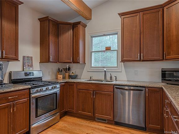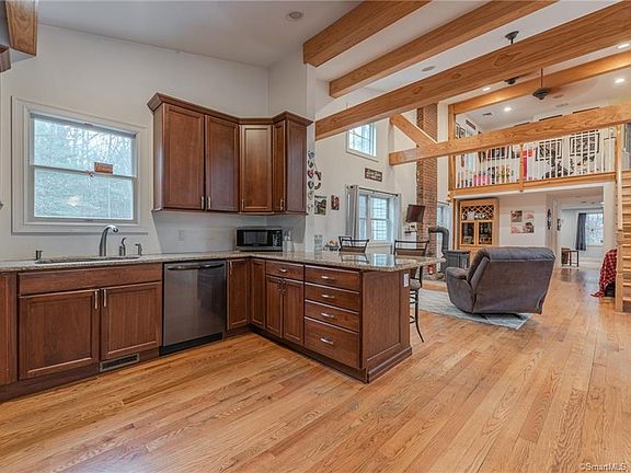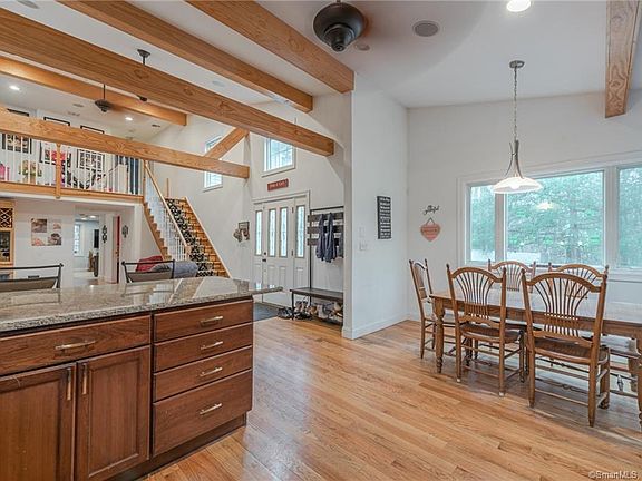 A quiet country retreat awaits you at 34 East Hill Rd in picturesque Oxford, CT. This recently renovated home features soaring ceilings with stunning beams that make quite a statement. Upon entering this home, you will be impressed by the open concept living as well as the light, bright airy spaces. The kitchen is the focal point boasting plenty of counter space, stainless steal appliances, and separate dining area surrounded by windows. The living room features a wood burning stove that provides plenty of heat for most of the home in the winter months, and the floor to ceiling brick adds character and charm. Proceed down the hallway and you will pass by the main floor bedroom with hardwood floors as well as the main floor full bathroom which houses the washer/dryer. Further down the hallway you will encounter the cozy family room with newer carpeting as well as sliding door access to the deck and patio. Upstairs you will find a loft area overlooking the main floor, which can have a multitude of uses, such as an office space or workout nook. The upper level also boasts two bedrooms and a well appointed full bathroom with tub/shower combo. Outside you will find a flat yard with plenty of space for all your activities. This home truly feels like a retreat away from the hustle and bustle of every day, perfect for a weekend home or year round residence, set up your tour today!