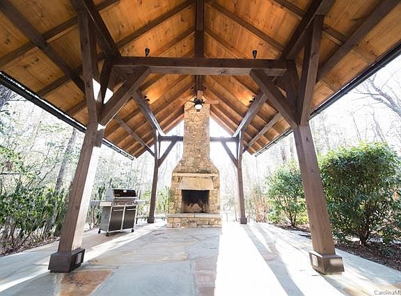 Magnificent mountain lodge with more than 200 ft of waterfront. Open concept living area features a high-end kitchen with lg granite bar, dining room that easily sits 12, and a living room with a magnificent stone fireplace and lg picture window w lake view. French doors lead out to the vaulted ceiling patio with fireplace. The home has 4 bedrooms with en suite bathrooms. Master on main floor. Media room and office on second floor and fabulous artist studio on third floor. Large dock with foundation for boat house. Located across the street from the new community nature park, this property consists of 3 flat lakefront lots that can be re-divided and lots allow for the building of two additional houses. Two lots have existing docks and a third dock can be built.