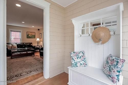 Updated, spacious in Town Colonial. Granite counter, stainless appliances in kitchen. Renovated baths, 4 spacious bedrooms. Hardwood floors throughout. Finished attic with additional 256 sq ft can be used as library/office/playroom. Additional office/studio/playroom with sep entrance also not included in sq ft. Attached 2 car garage. Close to train and Greenwich Ave.
