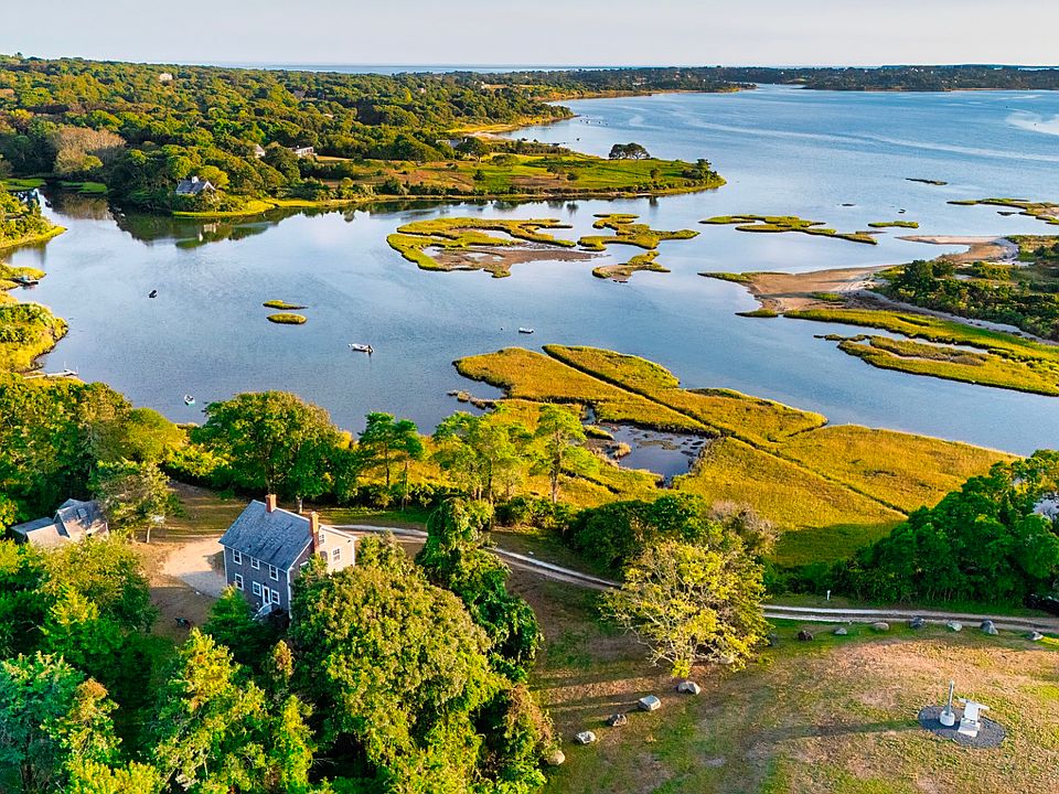 Waterfront house and guest house with a private dock on Menemsha Pond. This location is in the heart of Menemsha, a waterfront enclave within walking distance of this classic Harbor. Built and cared for over four generations by an Island legacy family, this property is unique among Island estates for its combination of privacy yet convenience and seclusion yet expansive views. To the Southeast, watch Menemsha Pond ebb and flow around sandy islands with 120 degrees of unobstructed view. To the Northwest, elevated rooms look out over the sunset on Menemsha harbor. A secluded lawn is partially shaded by healthy blue spruce and bordered by an ancient stone wall. To the south, the dock traverses the estuary into a private cove opening up to the main pond and the ocean. A secure environment surrounded by water on three sides. The property is only a short walk to the Menemsha harbor, beach, boutique galleries, and fresh seafood restaurants—from the daily catch from local fish markets to the fine dining of the Home Port. Southern orientation provides sun all-day to both the house and the guest house. Year-round water and new 5-bedroom Title-5 compliant septic. Unique remodeling and expansion options compared with other waterfront Island property due to the existing height, large attic with views, and a lower level with tremendous natural light allowing for valuable future living square footage. You are welcome to continue the legacy of this extraordinary real estate.