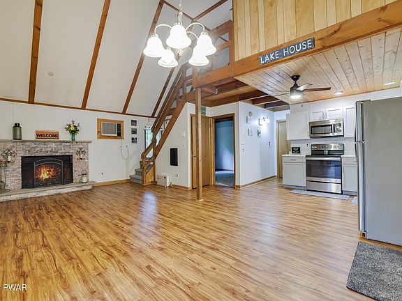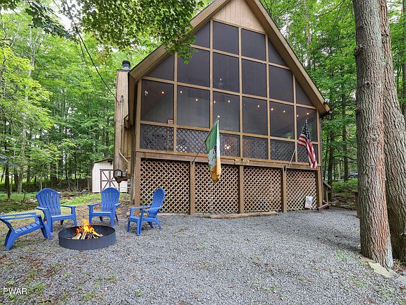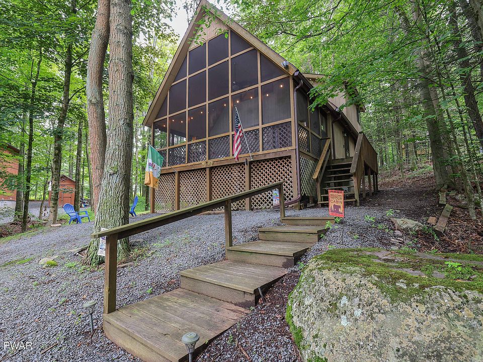 NEWLY PRICED - Cozy Poconos Chalet with Huge Screened Porch in The Hideout - a sought after four season amenity gated community in the Poconos. Just in time for ski season in the community and cozy nights by the wood burning fireplace, this 2 bedroom 2 Bath home with vaulted ceiling and open living area, updated kitchen and bathrooms boasts easy maintenance and everything essential in a mountain and lake retreat. Located on a cul-de-sac with easy access to Drafts for entertainment and eats. This home combines convenience and affordability. Whether you are seeking a potential vacation rental, weekend getaway or full-time residence, this move-in ready chalet checks off the boxes. (See the virtually staged photos to spark your imagination) The huge screened porch provides a true outdoor living room for summer living - the modern kitchen includes stainless steel appliances, tongue-and-groove ceilings - plenty of space to add an island -peace of mind and efficiency of a dry crawl space (storage!) with vapor barrier and a new hot water heater. A shed adds extra storage for seasonal gear, tools, and kayaks. Don't miss out! Close to Lake Wallenpaupack, Lake Ariel and Hamlin and only two hours from NYC and PHL. Real estate charm at its finest. Welcome Home!!