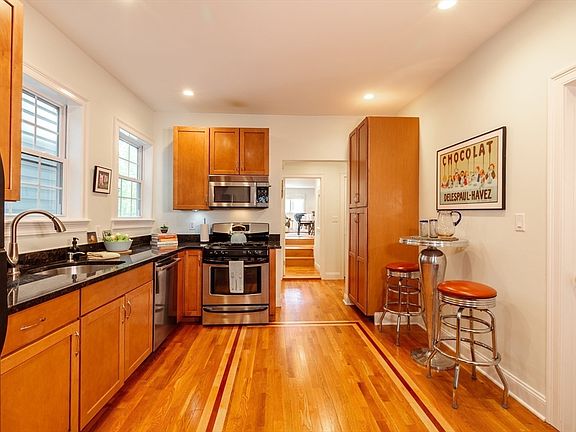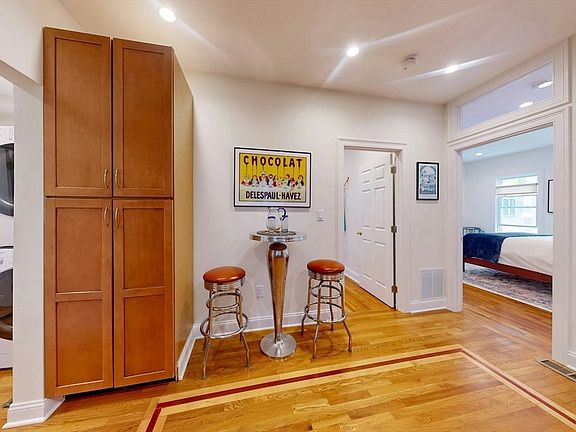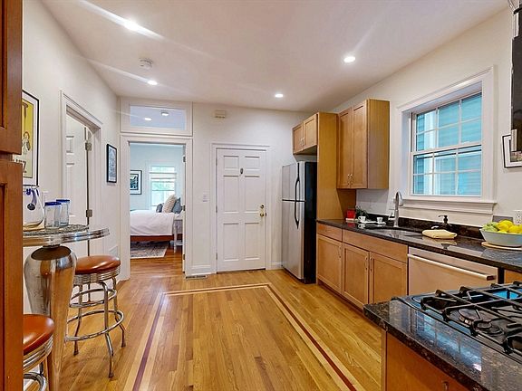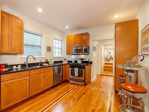 Walk to the bike path, subway, and all the delights of Davis Sq. from this roomy 2 bedroom/2 bathroom condo on a residential street. From the entrance hall, a door opens into the kitchen, with stainless steel appliances, ample maple cabinetry, stone countertops, and recessed lights. To the right are doors to each of the 2 bedrooms. Just beyond the kitchen is the laundry area with full-size washer and dryer. Opposite it is a full bath and a side door to the yard. A spacious, elevated living and dining area with picture windows stretches before you and leads to the large (13'x11') private deck. A second full bath is off the LR. The unusually deep shared yard has room for playing, gardening, and entertaining. Special features include gleaming wood floors with decorative inlays, central air, abundant recessed lighting, tiled bathrooms, and generous exclusive basement storage. Reach Tufts, Harvard, and MIT by foot, bike, or T. Quick access to Logan airport, Rt. 2, 93, 90, 95.