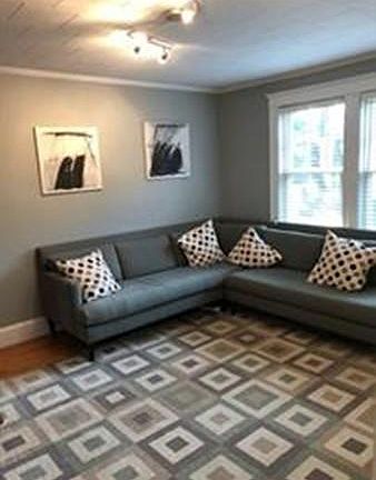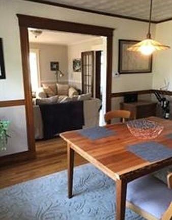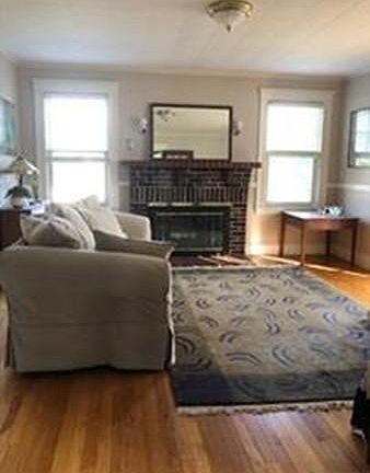Fully furnished 2 bedroom on 2nd floor in quiet neighborhood, 2-car tandem off-street parking. Very large sunny, airy second-floor apartment in two-family house. Hardwood floors throughout, close to Boston downtown express bus and 1 mile from Commuter Rail. 2017 bathroom with closet. Space for second bedroom or guest room. Master bedroom has queen-size cherry bed, matching armoire, dresser, mirror and window a/c unit. Small office and TV room: either could be second or guest bedroom. Large living room with working fireplace and two pairs of French doors. 56" smart TV in separate room with additional closet. Small office with closet and 3 windows. Dining room & breakfast nook with built-in hutches. Modern kitchen with breakfast bar, Sub-zero fridge/freezer, in-sink disposal and Bosch dishwasher. Electric stove/oven and microwave. Not shown here office, sunroom. This house was built in 1920, loving maintained. 27 windows and well-insulated walls and attic creating a tranquil oasis.