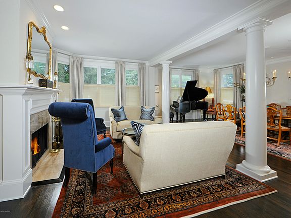 Beautifully orchestrated renovation makes this Victorian a contender for modern day living in classic old Greenwich style! Welcoming front porch and 2-story foyer filled with natural light opens to formal living room and dining room with fireplace, columns and bay windows. Sound system throughout, including a wonderful family room with fireplace. Exciting and new marble-mosaic kitchen with serving pantry has Wolf & Miele ovens, sub-zero wine cooler, refrigerator and freezer. Charming breakfast area with illuminated china hutch has French doors leading to blue stone terrace and private backyard. Windows facing the greenery bring a serene ambiance to the master suite with dressing room and lovely marble bath. Two spacious 2nd floor bedrooms, fabulous guest suite with private entry plus lower level gym/playroom/office. Seven minute walk to train and ten minute walk to town.