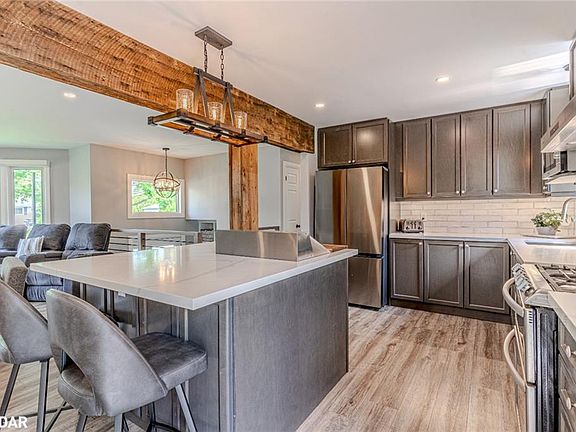 BEAUTIFULLY DESIGNED, MOVE-IN READY, & A BACKYARD BUILT FOR LUXURY OUTDOOR LIVING! Discover this truly exceptional home in a warm, walkable community surrounded by parks, sports facilities, everyday conveniences, and top-rated schools! This stunning property backs onto agricultural land with no direct rear neighbours, offering privacy and breathtaking sunsets over the open countryside. Enjoy seamless access to Snow Valley Ski Resort, hiking trails, and conservation areas, with the vibrant city amenities of Barrie and the sandy beaches of Wasaga just 20 minutes away. The beautifully landscaped front yard, maintained by an inground sprinkler system, leads to a generous driveway and oversized 2-car garage with room for RVs, trailers, or boats. The extended drive continues to a private back shop tucked in the trees, perfect for a home business, workshop, or serene escape. Your backyard oasis is ready for entertaining with a fully fenced inground pool, hot tub, a cedar deck and expansive patio, sauna, pool bar, outdoor shower, a charming gazebo, and a heated/insulated bunkie for guests. Two gas BBQ hookups and a power awning make outdoor hosting effortless and enjoyable all summer long. Inside, the spacious open-concept design connects sunlit living, dining, and kitchen areas with large windows and a walkout to the backyard. The custom chef’s kitchen features built-in island prep space and a breakfast bar, setting the stage for elevated daily living. Three generous main floor bedrooms include a primary suite with tranquil backyard views, while the sleek 4-piece bath adds a spa-like touch. The fully finished lower level offers a large rec room, additional guest bedroom, stylish 4-piece bath with a dual vanity, and a walkout mudroom. With a newer water softener system, refined finishes, and every detail thoughtfully updated, this #HomeToStay is completely move-in ready and waiting for you to enjoy!
