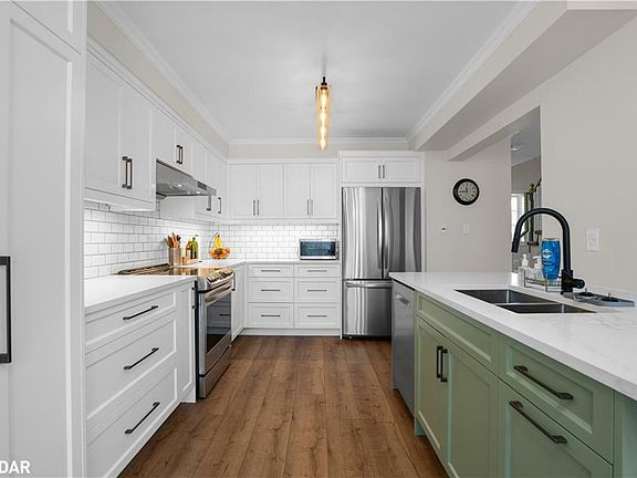 Incredible value with $$$$$ in recent upgrades and updates! Located on a quiet, family friendly street, conveniently located close to the Barrie South GO station, commuter routes, shopping and amenities. Step into a fully renovated main floor, with a chef inspired dream kitchen and flowing open concept design. High quality, full custom birch cabinetry with soft close drawers and dovetail joinery, convenient pull outs for spices and pantry items, large prep island with breakfast seating all finished with beautiful quartz counters and timeless subway tile backsplash. An equally impressive, full stainless steel appliance suite with induction range top will satisfy your culinary desires. Three generously sized bedrooms upstairs, the primary features a bright bay window, the front room has a gorgeous alcove which doubles as a writers nook, and the adaptable 3rd bedroom has an oversized walk-in closet for plenty of additional storage. The lower level is unspoiled, with bathroom rough in's and plenty of opportunity to customize to your unique taste. Walk out from your kitchen to the sunny rear yard oasis, where you will find a low maintenance rock garden inspired area to relax and unwind. This home backs onto the green spaces of a local park with several courts and walking paths, offering excellent privacy with no rear neighbours, and friendly neighbours beside. Private single car garage with large storage loft above, fully paved driveway and a rebuilt stone staircase complete the look and add to the curb appeal. A fantastic opportunity for first time buyers or down sizers alike, book your showing today, this one will not last!