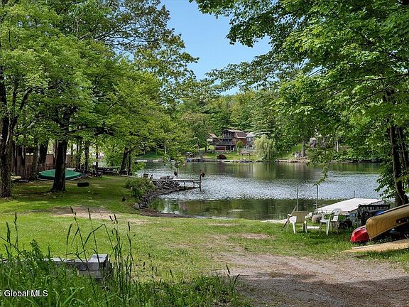 Experience serene living on Burden Lake with this unique A-frame home, full of rustic Adirondack charm. Located on a peaceful dead-end street, this 4-bedroom gem offers lake rights with nearby access to boating, swimming, and all things lake life. Step onto the spacious wraparound front porch and into a warm, inviting interior featuring a cozy wood-burning fireplace and an additional gas fireplace for extra comfort. The expansive, country-style eat-in kitchen is perfect for gatherings, and the newly added half bath complements the large full bath on the main level. Enjoy central air, a backup generator, public sewer, and generous living spaces throughout. Out back, unwind on the oversized deck overlooking a private yard complete with a fire pit and lush landscaping.