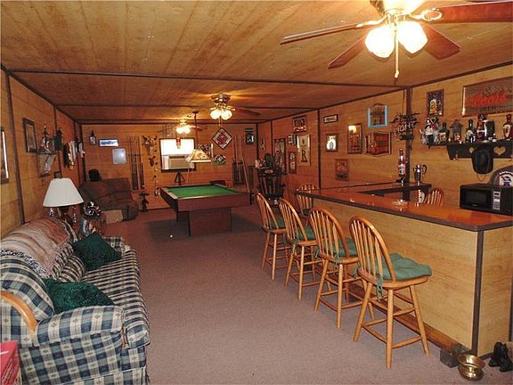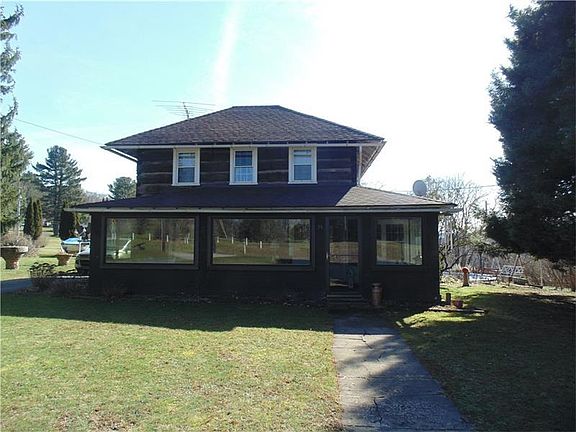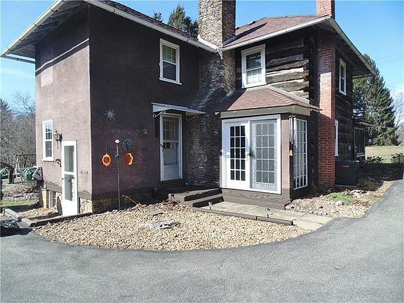 Log home dating back to mid to late 1800's with original hardwood, woodwork and stone fireplace with stunning finish work! Newer windows, A/C, hot water tank, and roof is about 15 years old. 3 stall detached garage is about 15 years old, and has finished bar and entertaining on second floor. Garage heated by wood burner. Yard features above ground pool and deck, koi pond, fruit trees, dogwood, self draining planters 100+ yrs old, along with a beautiful millstone. Home has a black bear carving that sits in side yard facing road. Paved drive, second shed/1 stall garage. Home has closed in front porch that needs only a portable heater for year round use. So many possibilities abound. Great views of Foxburg Country Club Golf Club! Meticulously kept, fresh and clean!