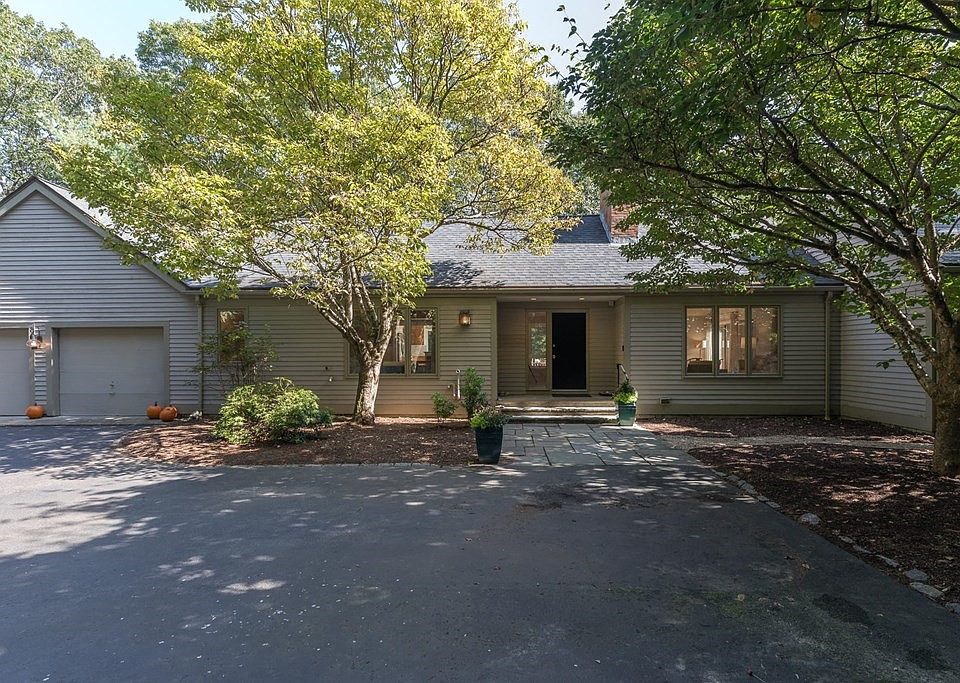 Custom 4-bedroom Contemporary offers one floor living, convenience, and privacy on 1.64 acres of land. Open floor plan, tasteful front entry, formal great room with fireplace, cathedral ceilings, walls of glass. Family room and sunny updated kitchen with quartz countertops, pantry, eat-in area. Porch wraps around back of home. Oversized mudroom with laundry, 2 car garage. Primary suite with large walk-in closet and bath with soaking tub. Office or bedroom with sunroom. Fin. walkout LL offers beautifully renovated bedroom with wainscoting, and 4th bedroom and potential 5th. Large recreation room. Exercise, and play area that can function as separate apartment. 3 attics and lots of storage. Outdoor spaces with play area and trails. Close to town center, Rail Trail, and Kendall Common MBTA stop. Enjoy privacy and serenity perched on a hill side in exclusive Webster Hill Estate Neighborhood. Top Rated Weston Public Schools. 5-bedroom septic with Title V in hand.