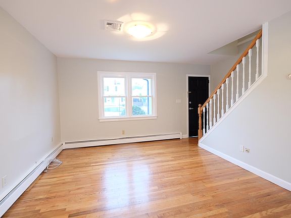 Duplex townhouse living style one family house. total of 5 rooms, can be used as a two or three bedroom unit . first floor - living room kitchen , Second floor - 2 bedrooms and full bathroom, Basement - finished room with heating and closet and full bathroom with walk out to yard. Large driveway for 3-4 cars, designated yard, central AC, baseboard heating. Tenant pays heat, hot/cold water, gas and electric. No pets, No smoking , Listed by Real estate management company.