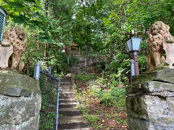 Nested high above street level this stone/vinyl Cape Cod can be reached up a pathway of stairs offering peaceful privacy. There is a first floor bedroom and two bedrooms on second level. Open landscape from kitchen, dining room and living room. Walk out to deck from one second floor bedroom, two tier decking at top of stairs to front entry. Good location. Renovation required.