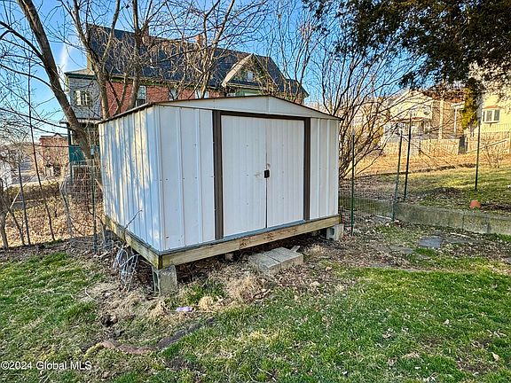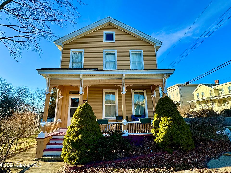 Two family home on an attractive corner lot that includes 3 additional surrounding lots. A great amount of craftsmanship went into this home built in 1867. The home has been well maintained and includes many modern upgrades. The first floor apartment features 3 beds, 1 full bath, living room, dining room and kitchen. A second apartment features 2 bedrooms, 1 full bath and living room. New fridge and new stove. Hard wood floors, vinyl siding, natural gas furnace. Large open yard with patio area and several sheds. Great space for those who like the outdoors, gardening or entertaining. Great owner occupied or investment home. Both apartments will be empty for closing. All lawn care equipment to be left for new owner.