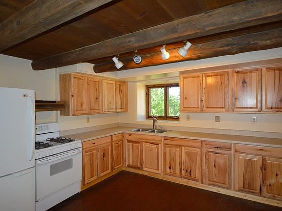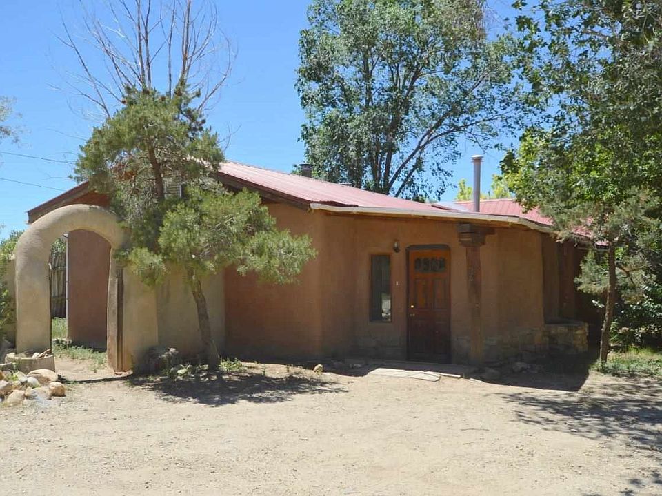 Classic affordable 2BR/1BA + office 1,628 sq.ft. true adobe home full of character and timeless southwestern touches. 2 kiva fireplaces, built-in bookcases, flagstone, saltillo tile and brick paver flooring. Eat-in kitchen with updated cabinetry and countertops. Spacious master bedroom with woodstove. Thick adobe walls, passive solar orientation, skylights, + small fenced and adobe walled yard perfect for dogs or gardens. Large heated mudroom entry. Community sewer, shared well, natural gas, situated on 0.25 acres. Convenient access to town. Easy on the pocketbook too!