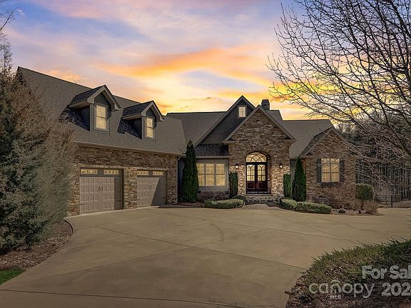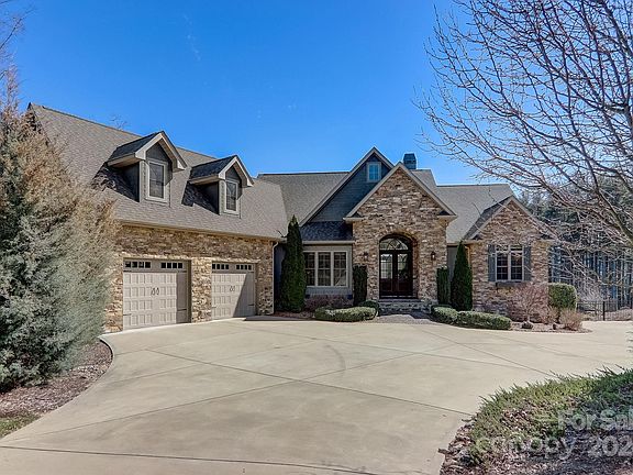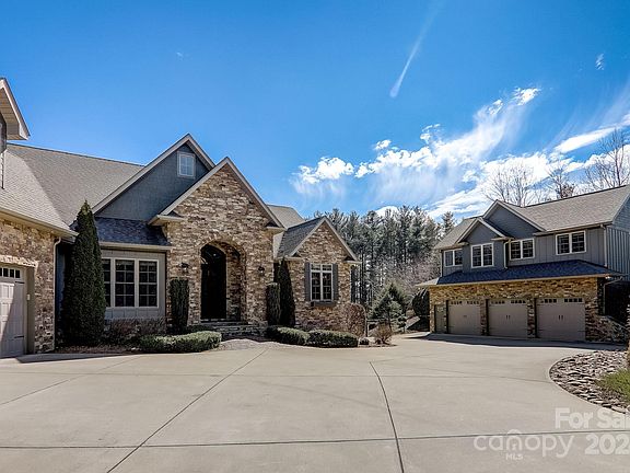 Unique property, nestled on a very private 5.67 acres in Ledgestone (not part of HOA), zoned Open Use, and only 17 mins. to downtown Asheville. Property consists of a main house and a separate carriage house above a three-car garage — perfect for guests, or as a rental. Living room boasts a coffered ceiling, a stone fireplace, plus a wall of windows for bringing in mountain views. Kitchen has a granite-topped island, high-end cabinets, a Sub-Zero fridge and a Wolfe range. Primary suite has deck access, walk-in closets, and a tray ceiling, plus a luxurious bathroom with radiant floor heating, walk-in shower and separate soaking tub. Downstairs are 2 bedrooms, 2.5 baths, and a den that leads to a covered patio. Special features include a full-house backup generator and a central vacuum cleaner. Plenty of outdoor living with year-round, long-range mountain views from the covered back deck, a level, partially fenced yard with firepit, and a lower-level patio. Showings Start March 10th.