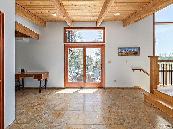 Magnificent 3-bedroom home at Echo Hills offers an exceptional blend of luxury, comfort, and breathtaking scenery! Discover the unparalleled craftsmanship & exquisite attention to detail this outstanding mountain retreat showcases! Situated in the fantastic mountain town of Evergreen, this property boasts a private driveway that leads into the oversized heated garage. Inside, you’re greeted by a bright foyer with direct access to the back deck. To the right, you’ll find a spacious & formal living room with a cozy wood stove & windows galore that allow spectacular panoramic views and sights of the Denver city lights at night. The abundant natural light floods every corner of the home, combined with the wood flooring & exposed beamed ceilings, create a warm & inviting atmosphere. Understated elegance & subtle modernity seamlessly mix in this refined kitchen equipped with blue cabinetry, high-end stainless steel appliances, granite tile countertops, mosaic tile backsplash, a walk-in pantry with a sliding barn door, and expansive windows providing uninterrupted views of the surrounding mountains. Upstairs, you’ll find the private owner’s suite, a true sanctuary nestled among the treetops. Skylights bathe the room in natural light, while the balcony offers a relaxing spot for contemplating colorful sunrises. The massive walk-in closet allows room for an office, and the ensuite allocates a spa-like retreat, featuring a dual vanity & a tub/shower combo. Outside, the sizable deck & patio are perfect for entertaining or enjoying alfresco dining, where you’ll be treated to sweeping views. Escape the hustle & bustle of city life & relax while breathing the mountain's fresh air! Close to hiking, biking, huge Denver Mountain Parks & Jeffco Open Space. The property is located 15 minutes (7.5 miles) from Echo Mountain Ski Resort, a 40-minute drive to Denver & 20 minutes to Evergreen. For additional photos and videos visit: https://dashboard.rocketlister.com/anon/website/609669