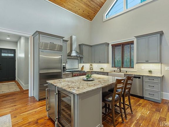 Luxurious mountain retreat in the heart of Highlands, NC! Just two blocks from Main Street, this exquisite property offers the epitome of elegance and comfort, with the vibrant downtown area at your doorstep. Inside you are greeted by the warm glow of Brazilian hardwood flooring, leading you through the spacious interior. Entertaining is a delight with three distinct living areas, each offering its own ambiance and charm. The main level boasts an open living area with vaulted tongue and groove ceilings adding a touch of rustic elegance. A high-end kitchen flows to the dining and a generous living room that opens to an expansive covered porch; both the living room and the porch have their own fireplace - the perfect spots to cozy up and savor the fresh mountain air. Step outside and be serenaded by the soothing sounds of Mill Creek below the home, creating a tranquil backdrop for outdoor gatherings or moments of quiet reflection. The master suite beckons with its indulgent heated bathroom floors, ensuring your comfort even on the chilliest mornings. With six bedrooms and five-and-a-half baths in total, there's ample space for family and guests to unwind in style. Downtown Highlands is a short stroll away, where you'll have access to a wealth of dining, shopping, and entertainment options. Explore the charming boutiques, indulge in gourmet dining experiences, or simply soak up the small-town charm of this beloved mountain community. This exceptional property is being sold furnished, allowing you to move right in and start enjoying the mountain lifestyle. Whether you're seeking a full-time residence or a luxurious vacation getaway, this Highlands retreat offers the perfect blend of sophistication and natural beauty, with the added convenience of downtown living.