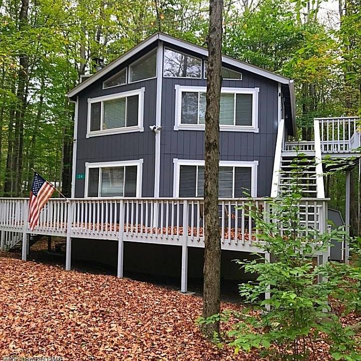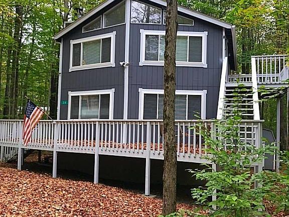Welcome Home! This large Pocono Chalet features 4 bedrooms, remodeled family room,kitchen and bath! All new appliances, new hot water heater, bright and airy living room with cathedral ceilings and propane fireplace insert for those cold winter nights! Over sized windows and 2 sliders leading to the multi-tiered deck to enjoy during Spring, Summer and Fall! Outside cameras, circular driveway, fire pit, over sized shed and a larger corner lot! Down the block from the heated Minisink Pool, doublegreen-belted lot! Excellent rental history on file. Fully turn-key! What you see is what you get! Double Lot.