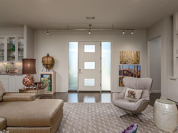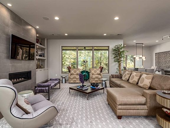 Contemporary one-level home w/ beautiful features & designer finishes throughout. The entry opens to a spacious great room w/ built-in bookcases flanking the well-appointed f/p w/ large windows overlooking the backyard & wooded green space. The gourmet kitchen features a gas cooktop, convection oven & microwave, dishwasher, built-in bistro table, wine frig and wet bar w/ Scotsman ice maker. The master suite is split from the 2 guest bdrms & hall bath. Three car garage, custom window coverings plus more!