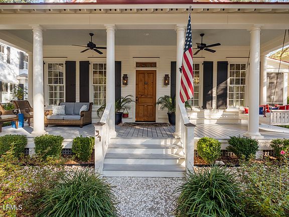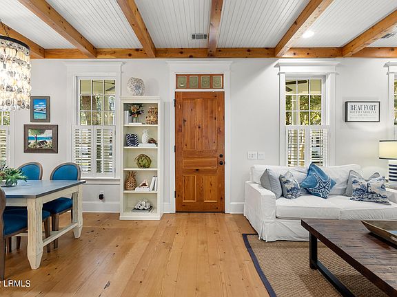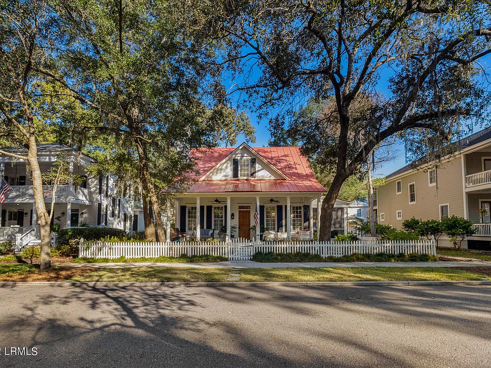 This stunning southern home is ''quintessential lowcountry'' starting with its tabby shell chimney. Another timeless design by Allison Ramsey and built by Allen Patterson; there is attention to detail at every turn. Featuring an open floorplan with high end finishes, you will be in awe from the moment you walk through the ''white picket fence''. Enjoy the ultimate southern hospitality of the expansive front porch with gas lanterns or the simple southern charm of the enclosed side porch which is perfect for catching the afternoon breeze coming from the community's deep-water vistas of Factory Creek. When you walk in the front door - reclaimed from an 1800's Kentucky Bourbon Distillery - you will truly appreciate this home's one of a kind finer upgrades and feel instantly at home. There is no shortage of attention to detail with exposed brick from a 1909 South Carolina farmhouse, and hardwoods recovered from an 1818 North Carolina textile cotton mill. The chef's kitchen features granite countertops with beautiful to the ceiling seeded glass cabinetry, Viking/Wolf appliances with a large walk-in pantry. The main home and "carriage house" combine for a beautiful 4 bedroom and 4.5 bath compound with outdoor patio and firepit. A primary suite is located on the first floor along with a versatile flex space currently used as an office. Upstairs you will find a second primary bedroom with a large walk-in closet and ensuite bath. There is an additional guest room and full bath upstairs as well.