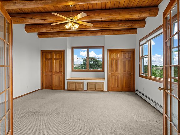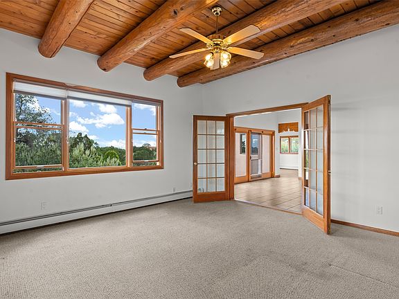 Custom-built DiJanni single-level, passive-solar one owner Eldorado home. Mountain views! French doors lead to a spacious second living area which could be studio space, playroom, home gym, media room or library. Pretty vigas in main areas and a kiva fireplace in the living room. The two guest rooms have clerestory windows with insulated blinds on a remote. Easy floorplan with nice entry and attached 2-car garage. Brand new water heater and freshly painted. Only two houses off the pavement. Fenced dog run. NO STEPS. Easy walking distance to the pool, dog park and community center. Close to the Eldorado Community School and easy access to I25.