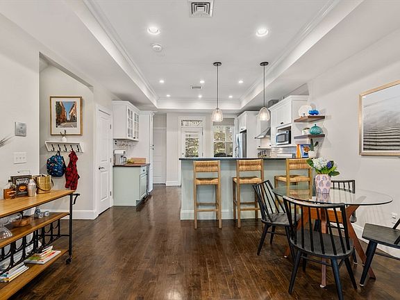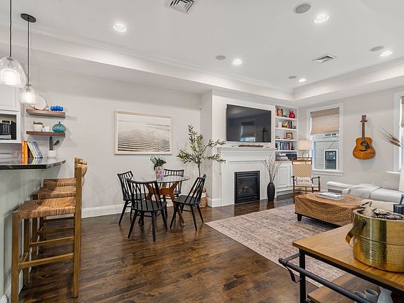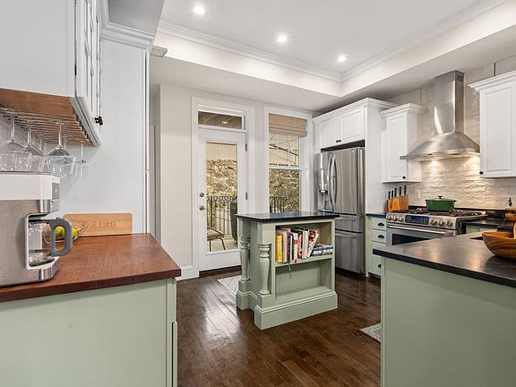 Located on a picturesque tree-lined street, this stunning brick row house offers 3 bedrooms, 2 baths, and over 1,500 sq. ft. of beautifully updated living space. Just steps from coffee shops, parks, and transit to downtown, this duplex condo blends classic charm with modern upgrades. The renovated custom kitchen features soapstone countertops, a stylish backsplash, and a wood-top bar area with a wine fridge. A glass door off the kitchen leads directly to the private deck, bringing in abundant natural light and creating the perfect flow for entertaining. The open living-dining area includes gas fireplace spacious enough for full dining table. The king-sized primary bedroom showcases elegant moldings, while a bonus room offers flexibility as an office or guest space. Both bathrooms have been updated, with a glass-enclosed shower downstairs and a soaking tub upstairs. Additional highlights include hardwood floors, central AC, in-unit laundry, private storage, and a courtyard garden.