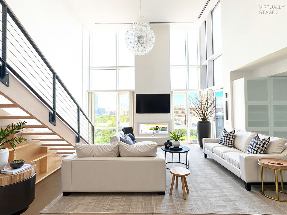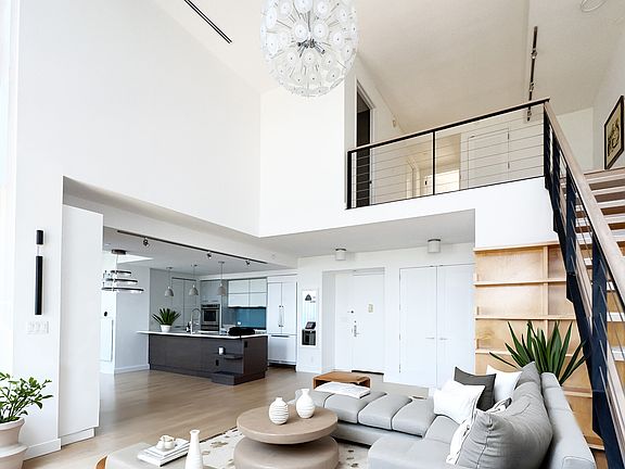 This spacious duplex offers over 1,600 sq ft of living space, double-height windows, and two private balconies with stunning views of the East River and Manhattan skyline.