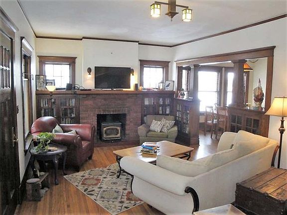 This lovely Craftsman-style, 2-story home is located on a corner lot within walking distance of the library, downtown, restaurants & parks. An enclosed front porch provides a welcome approach to the 1917-built home which features quality woodwork, hardwood flooring & abundant windows. The living room is graced by a brick wood-burning fireplace that is flanked by bookcases, & columns divide it from the formal dining room with built-in hutch. Kitchen amenities include ample cabinet & counter space, a pantry & a breakfast counter. A 1/2 bath & office or bedroom complete the main level. Upstairs there is a master bedroom with walk in closet, 2 additional bedrooms, a full bathroom, a sunroom & several built-ins. Laundry, utilities & storage space are located in the basement. The fenced in back yard has a patio & leads to a 1 1/2 car detached garage. Updates include roof shingles on the home (2017), furnace (2011), & windows in the master bedroom. Appliances & a home warranty are included.