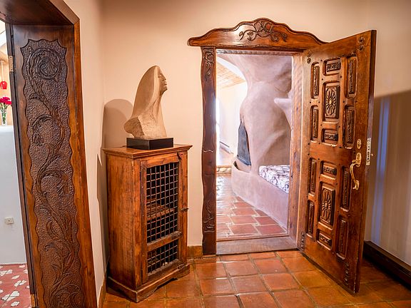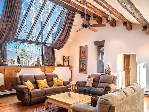 Welcome to El Santuario . Custom built in the late 1970 s, designed by owner and Taos artist Rod Goebel, this exquisite compound is a one-of-a-kind Old World Northern New Mexico masterpiece! This beautiful, efficient and meticulously maintained compound situated on 6.23 acres is truly a hidden gem! Guesthouse has been a successful short term rental, reviews on Airbnb are top notch. See "virtual tour" above for Airbnb link. Nestled amongst mature aspens at the end of a road, this home is private, quiet and a welcomed haven from all the hustle and bustle. The 3,911 square foot 2 bedroom / 2 bath main house and 1,259 square foot 1 bedroom / 1 bath adobe guesthouse boast of many traditional features including reclaimed barn wood doors, brick floors, Spanish tile and hand carved doors (inspired by the Fetchin house). Architectural details and quality craftsmanship throughout. Dramatic living spaces a fireplace in the den is an artist inspired design, gold leaf ceiling in the living/dining room (formerly the artist s Northlight studio) are just a few of the unique artistic touches. A large, covered portal with dining table for gathering and dining al fresco, hot tub with chaise lounges surrounding a fire pit create a spa like ambience, a chapel reminiscent of old New Mexico, a studio for star gazing plus several meandering paths leading to other sacred spaces where one can retreat, relax and rejuvenate. A spacious greenhouse for the gardening enthusiast. Spring fed pond, seasonal stream, aspen groves, fruit trees and wildflowers add to this nature sanctuary s canvas. There are 2 wells and natural gas. A 3-car garage with a 3-car carport complete the picture. This property has so many possibilities. Only 12 minutes to downtown Taos and a short drive to Arroyo Seco and Taos Ski Valley!