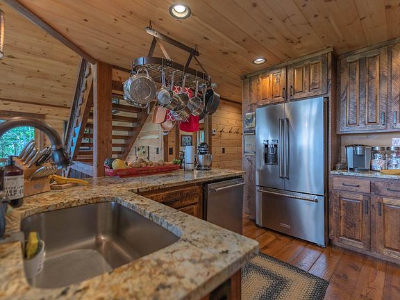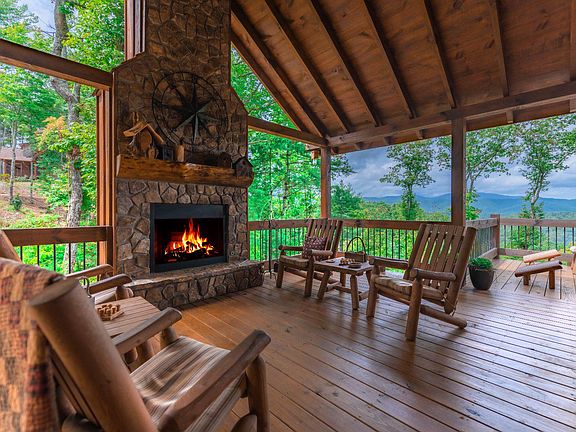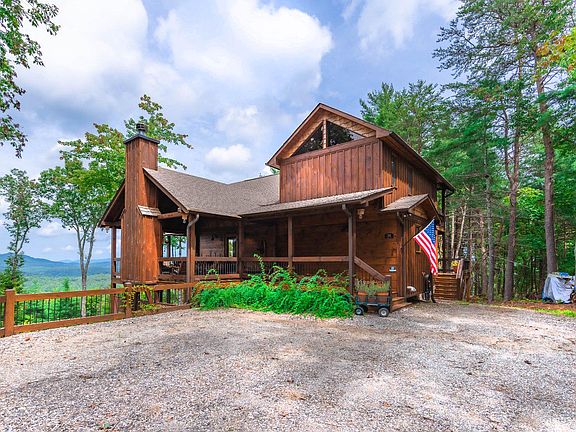 Stunning Cabin with Storybook Setting & Views Galore close to historic downtown Blue Ridge, USFS trails & Jacks River...craftsman quality with rustic flair & distinct detail...3 bedroom/3.5 bath style cabin is perched on large wooded tract including extra lot with towering hardwoods & lush, gentle landscape near end of road, lavish living area boasts sky high ceilings & "wall of glass," massive stone fireplace in great room, unique & warm finishes, plentiful windows, custom cabinetry w/leathered granite counters, tile showers & baths, upscale fixtures & extras throughout...finished terrace level w/wet bar, den/rec room with fireplace & guest qtrs, oversize "party porch" features fireplace & relaxing views, multi levels of porches & decks are great for outdoor entertaining with hot tub, terraced outdoor living with fabulous fire pit, plenty of parking in rustic community w/ultimate privacy, convenient yet tucked away, tasteful furnishings available separately for a turn key deal...A Step Above! Perfect for full time, much needed getaway or great rental potential!