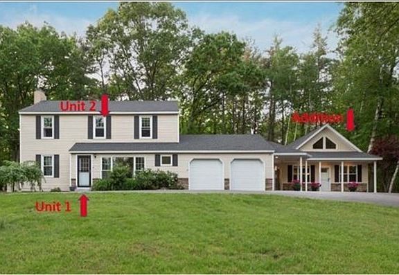 Get the whole gang under one roof. A unique multi-family setup in Londonderry. 2 units in the main Colonial style home. 2 bed unit on the first floor and another 2 bed unit on the 2nd floor. The addition to the right of the home is a standalone space (similar to an In-Law). This is not considered a 3rd unit by the town but is fully functional on its own with kitchen, full bath and laundry. Live in one unit and rent the other or just put everyone into their own standalone space. The options are many. Do not mistake the Colonial as a single family home (this is a common misconception), the main building on the left is a legal two-family home originally built that way. The units each have their own electric meters but the main home is shared baseboard heat by oil. The addition has a forced air furnace by propane with central air and has a separate electric meter as well. Propane only services the addition. If you need multiple spaces for your lifestyle, this is an ideal option!