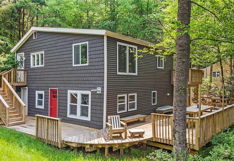 Nestled onto a sloping wooded lot – with serious treehouse vibes – this charming retreat is the perfect jumping off spot for a relaxing weekend away in the Catskills. It’s being offered fully furnished, cute as can be, and ready for some memories to be made! Anchored by a beautiful brick fireplace and large center island, the spacious kitchen/living/dining area is well appointed for cozy nights in or dinner parties with friends. There’s plenty of space to spread out, and every nook and corner has been thoughtfully furnished with perfect spots to curl up with a book. The renovated kitchen has tons of great counter and storage space, a double farmhouse sink, a subway tile backsplash, and that large center island. If you ever wanted counter space to spread out while cooking, this is definitely going to fulfill that wish!!