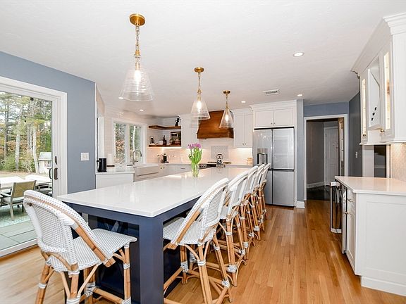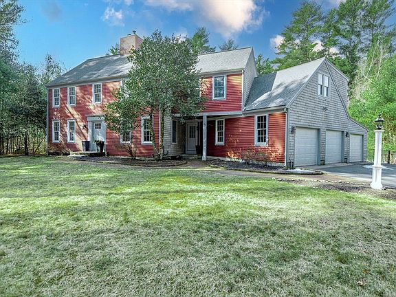 Welcome to 34 Pinehill Lane and see this fabulous center entrance, 2732 square foot Colonial, with finished basement. Located on a cul-de-sac, this beautiful home in River's Edge, boasts of a designer kitchen redone in 2023 with a 6 person spacious island with quartz countertops and high end appliances. The formal dining room and stunning living room with fireplace and detailed moldings, also offers beautiful hardwood floors and built-ins. The three season room is a perfect place to relax with your favorite novel or entertain friends. The 2nd floor offers a wonderful primary suite that includes a sitting room, office, and a spacious bath with separate steam shower.Three additional bedrooms and another 2 full bath complete the 2nd floor. The bonus room in the finished basement is great for working out or a play area for kids. The backyard is fenced in, 3 car garage, FHW by oil, town water and sewer. Truly a fabulous place to call home.