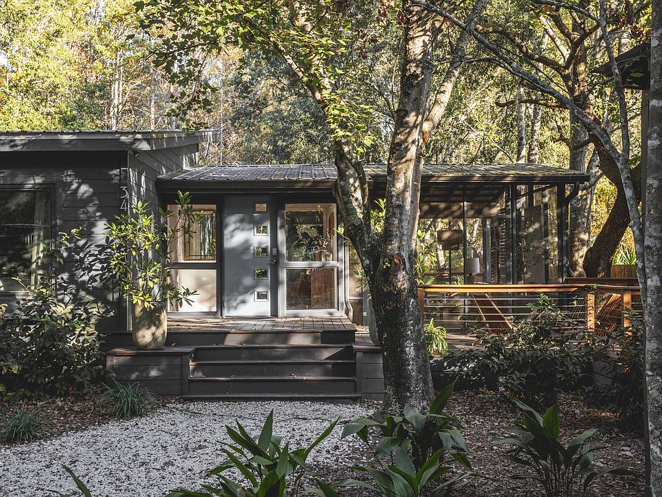 Design centered Airbnb compound in Santa Rosa Beach with 146K gross in 2024. Eight minutes to Blue Mountain and ten to Grayton. Tucked on nearly half an acre, the property feels like a private retreat under mature live oaks, citrus and soft uplighting. Main home shows vaulted shiplap ceilings, clerestory windows, bold fireplace wall, layered rugs and warm earth tone furniture over heart pine and painted floors. Kitchen keeps a crisp white and dark contrast with brass accents and modern fixtures. Bedrooms open directly to the deck and pool for true indoor outdoor flow. New heated saltwater pool finished in 2023 sits on a wood deck with lounging and dining zones. Multiple outdoor showers and screened spaces give guests a boutique retreat feel among the trees. Freshly remodeled and updated.
