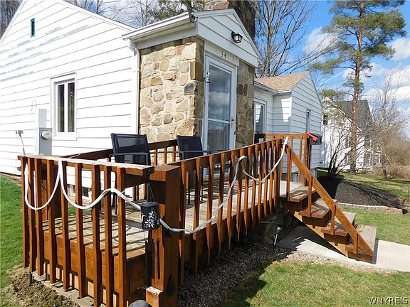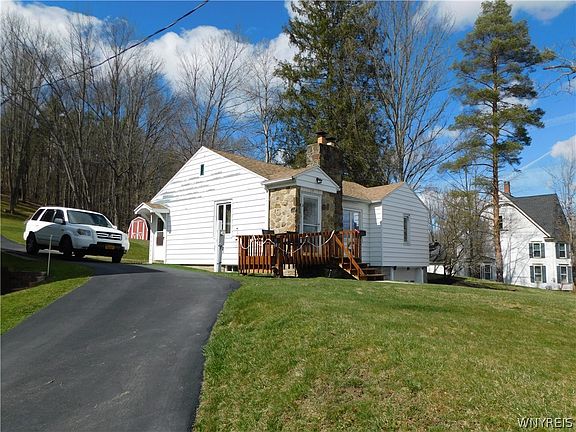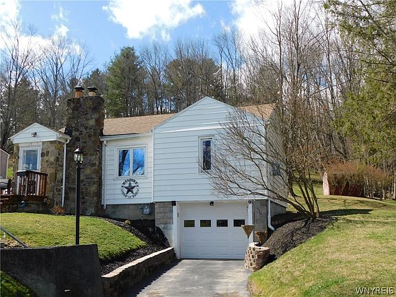 Cozy, well maintained ranch in the village of Cuba, NY., move in ready! Note the beautiful exterior stone chimney and entranceway! Quiet village street - 1/2 acre lot. Property has 2 driveways - black top driveway to deep 1 car garage, circular driveway for vehicle use was added to drive to the back of the house for easier access to the back door. Nice concrete steps from street in excellent condition. Newer small deck on front, new casement windows throughout, newer roof, nice original hardwood floors and charming built ins, newer overhead garage door, lots of storage. Nice fully equipped eat in kitchen w/ like new dishwasher overlooks backyard. Two nice size bedrooms with closets. Full bath centrally located. Fireplace gas unit is heat source. Walkout basement has workshop set up. Nice first home purchase or if you are thinking about downsizing.