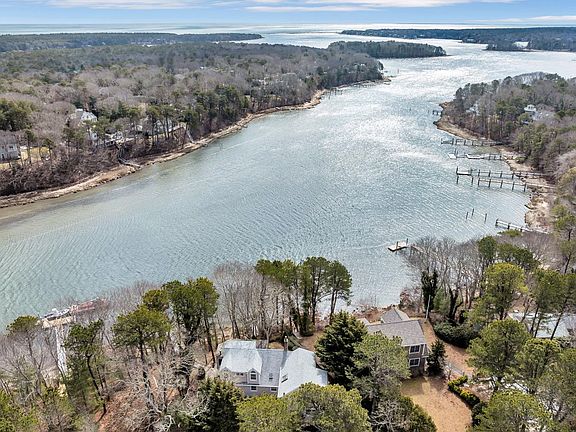 Beautiful waterfront home with a private dock on Shoestring Bay! New roof and new siding and trim where needed, completed in 2025. This sun filled home offers an open floor plan, with kitchen, dining and living areas with soaring ceilings and a cozy gas fireplace. A 4-season bonus room with oversized windows wraps the waterside of this home providing an abundance of natural light, breathtaking views of the glistening bay and the comfort of privacy. The water view primary suite features 2 walk in closets, a full bathroom with dual vanities, shower plus jacuzzi tub. The walkout lower level offers additional living space, 1/2 bath. and direct access to the tiki bar, plus an outside shower! With this rare and exceptional one owner property you will look forward to spending your Cape Cod summers fishing, kayaking and boating, from your registered dock, Great outdoor entertainment areas.3 levels of living. This one is worth the look! Schedule a showing today!