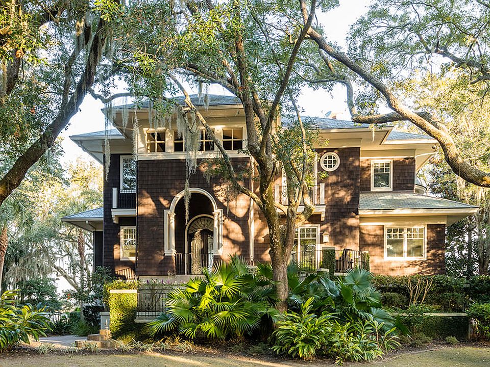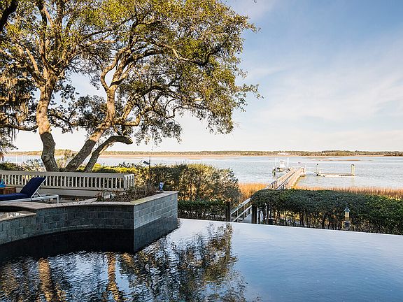 Architecturally stunning from top to bottom, this shingle-style, Rhett's Bluff home nearly fades into its waterfront setting along the Kiawah River. Abundant windows, iron railings, multiple porches, a slate roof, and turret give this home instant curb appeal. Majestic live oaks offer privacy while a private, deepwater dock with boat lift provides instant access to Lowcountry's waterways and is positioned perfectly for viewing year-round sunsets. One of Kiawah's most history-rich communities, Rhett's Bluff is flanked by Bass Pond and the Kiawah River and offers a neighborhood pavilion and boat landing. Members-only golf, dining, fitness, and spa amenities are just a short walk or bike ride away from this central Island location, just beyond the second security gate. Timeless design is reflected in elegant detailing and upscale finishes such as porthole windows, custom, artisan-crafted copper lanterns, burnished steel and glass entry doors, wide plank hardwood and bluestone floors, custom cabinetry, coffered ceilings, and extensive custom trim and moldings throughout. From a dramatic, arched, front entry porch, the two-story foyer opens into the formal living room where a wall of floor-to-ceiling frameless windows blur the lines between land and river. A gas fireplace with granite surround and access to the rear covered porch, kitchen, and dining make this central room a much-loved gathering spot. The spacious, wrap-around kitchen offers abundant marble-topped counter space and custom cabinetry for storage. A built-in refrigerator and range hood join a suite of upscale appliances including a 6-burner range and beverage chiller for stylish convenience. Just beyond the kitchen, a family room with a gas fireplace flows into a circular morning room overlooking the Kiawah River. A guest bedroom with full bath joins a formal dining room to round out the main floor. Upstairs, the primary suite and two ensuite bedrooms each enjoy access to either a riverfront screened porch or private balcony. Overlooking the Kiawah River, the primary suite has a custom built entertainment center, his and her closets, a circular office with coffee bar, sink, and storage, and a large bath with dual vanities, soaking tub, and walk-in shower. A curved set of glass doors with transoms and sidelights open onto the screened porch. Designed with entertaining in mind, the expansive Ipe deck surrounds a heated saltwater pool and spa and outdoor grilling station. Set beneath a mature live oak, the deck offers ample room for riverside lounging and al fresco dining. The 2,264-square-foot lower level is fully conditioned with an epoxy-coated floor and accommodates parking for up to six cars plus boat storage, a workshop, play room, and extensive storage. A Kiawah Island Club Membership opportunity is available with this property.