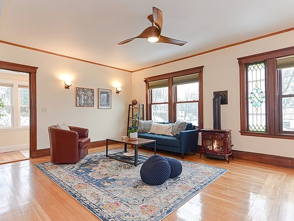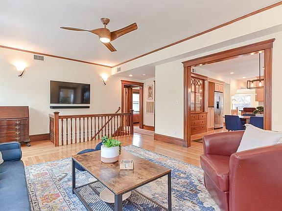 Experience the harmonious blend of timeless charm and modern amenities in this 4-bedroom, 3-bathroom unit on a quiet residential street in Newton. Occupying the top two floors of a two-unit condo, this sun-drenched home lives like a single-family. Enjoy the living room's stained glass and gas-burning fireplace or unwind in the sunroom, ideal as a home office. Enter the dining room with a built-in cabinet and open floor plan to the updated kitchen. Three bedrooms on the main floor offer flexibility and privacy, with two full bathrooms, another sitting area, and convenient laundry. Ascend to the expansive primary suite with a private deck, walk-in closet, skylights, built-in bookcases, luxurious bathroom with Jacuzzi tub and large tiled shower, and private sitting room. With its proximity to a convenient bus route to Boston and 2 new energy-efficient electric heating/AC units, this home presents an unparalleled living experience, combining urban accessibility with suburban tranquility.