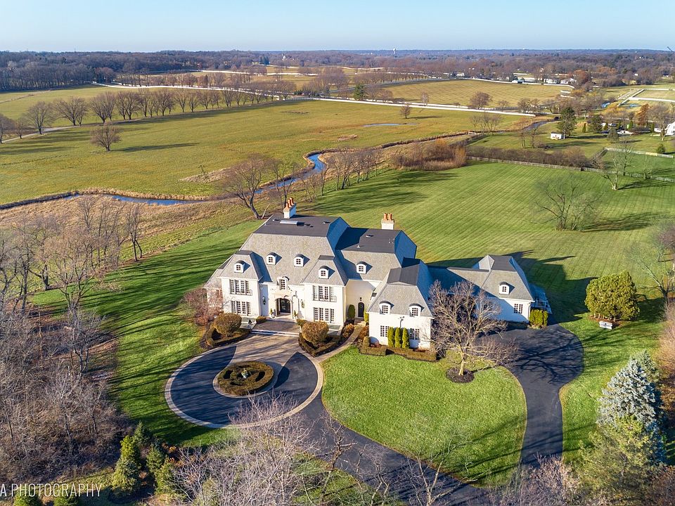 A rare opportunity to own an absolutely breathtaking French Provincial chateaux set on 5 serene acres majestically overlooking the 246-acre Hill 'n Dale Preserve. Timeless luxury is found throughout with elegant appointments, meticulous architectural details and incredible craftsmanship representing the ultimate in beauty and lifestyle. This stately home is ideal for large scale entertaining (as featured in Luxe magazine) as well as relaxed family fun. Featuring grand sized formal rooms, including a spectacular 2-story great room and living room both with grand fireplaces, an award-winning chef's kitchen, a handsome library with attached study and wrapping room, and a magnificent first floor primary suite with limestone fireplace and spa-like his & hers baths including adjacent custom dressing rooms. A striking iron and glass 10-ft double door entrance leads to a cascading dual staircase, and a 20-ft tall wall of windows overlooking the rear of the property. All main floor rooms have massive French doors leading out to a 50-ft Brazilian teak deck, able to accompany 60 people for spectacular dinner parties, as the sun sets over the endless sightlines of Barrington Hills nature at its prime. Connected to the main deck is a more intimate bluestone and brick terrace with a large limestone fireplace and grilling area. The expansive second level features five secondary bedrooms each with spacious, custom walk-in closets, four with en suites and private balconies, and the fifth with a media area and access to a nearby full bath. A large exercise room, attic with ample storage and rooftop deck complete this well-appointed 2nd floor. The seamlessly flowing floor plan continues to the finished walk-out lower level offering 10-ft ceilings, multiple recreation and living areas including a home theater, 2-sided fireplace, a large bar and game area, a pet spa room, and full bathroom. Three sets of 10-ft French doors lead out of the lower level to a large terrace covered with tongue and groove wood, allowing for an outdoor theater, dining and living areas; allowing you to again take in the private, yet expansive, picturesque view of Spring Creek, pond and the Preserve. A stately circular driveway welcomes guests and for the car enthusiast there are 5 garage spaces; a porte cochere adds not only sophistication but great convenience for arrivals and departures. A separate entrance with attached garage leads to the east wing of the home; ideal for guests or an in-law arrangement. Every room of this spectacular home is flooded with light and the beauty of the land; and is near horse trails, town, train, shopping, restaurants and award winning D220 schools. An unparalleled lifestyle experience!