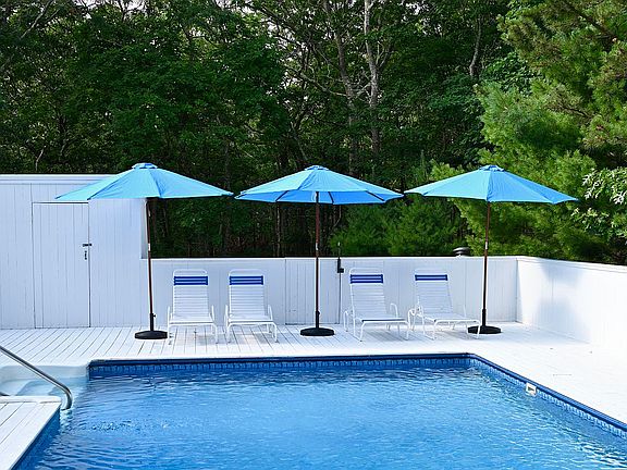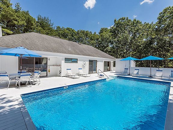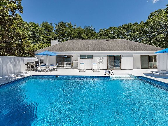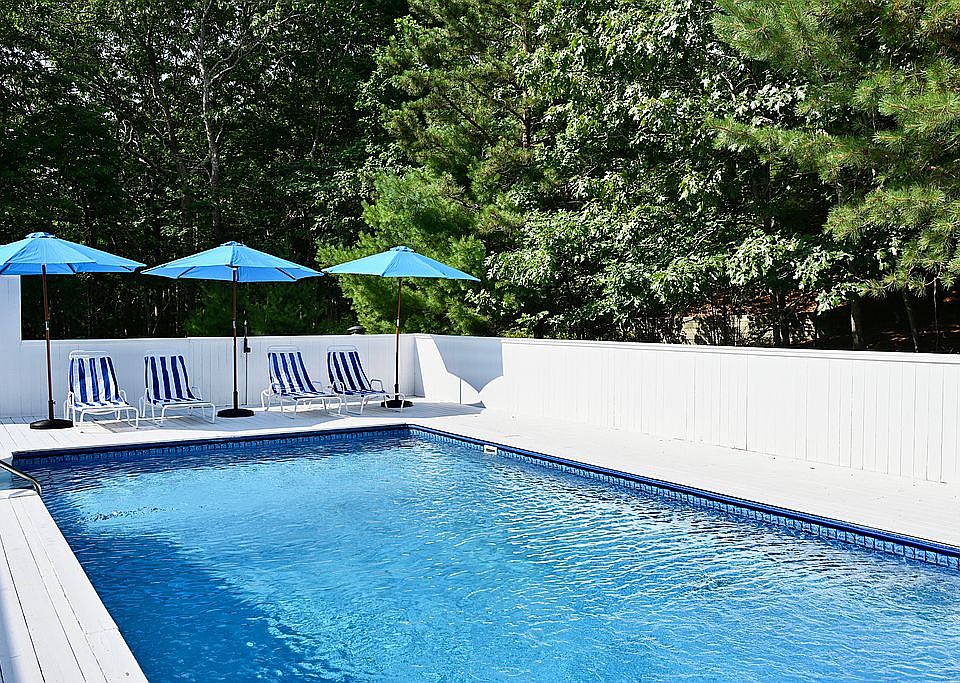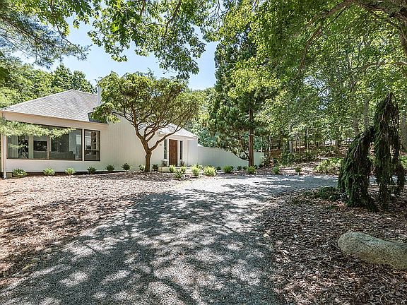Located on a desirable cul-de-sac just minutes to the village sits this stylish contemporary home. The one-level home features four bedrooms, three bathrooms, a den (or 5th bedroom) and is designed for the modern lifestyle. The open living and dining room with soaring ceilings features a sleek gas fireplace, two sitting areas and glass doors and skylights that flood the space with natural light. The renovated kitchen offers stainless steel appliances and counter seating. The spacious primary suite showcases a renovated spa-like bathroom with soaking tub and glass-enclosed shower. Three additional guest bedrooms all feature sliding doors to the outside deck. A fifth room is ideal for additional guests, or could be used as an office/den. Outside, the large sun-drenched deck surrounds the 16x36 heated pool and provides plenty of al-fresco living/dining spaces, as well as an outdoor shower. Walking trails are just a few steps away connecting you to 20+ miles of trails in either direction. The private, wooded setting is just moments to Round Swamp Farm, and a short drive to the ocean and bay beaches, and the world-class amenities of East Hampton village.
