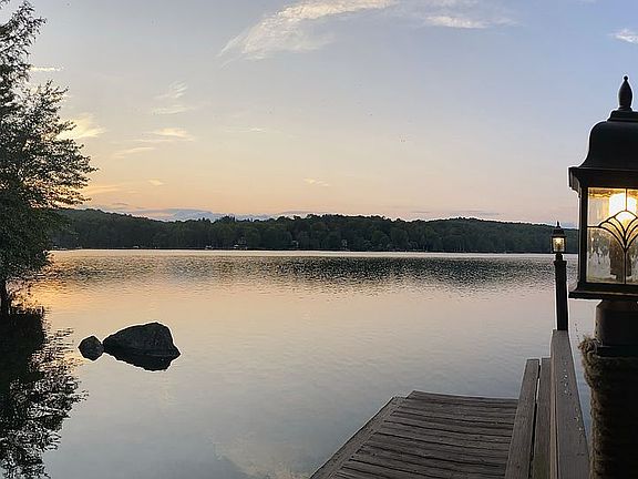 POWERBOATING LAKEFRONT HOME LOCATED AT THE END OF A CUL-DE-SAC IN A FOUR SEASON AMENITY FILLED COMMUNITY IN THE NORTHERN POCONOS, just two hours from the NYC and Philadelphia Areas. This beautiful chalet is tucked in the woods for privacy; it offers plenty of outdoor space including a deck, screened in porch and large deck by the lake. The home has been updated with a modern yet ''woodsy' feel. The main level is open Floor plan, lots of light from the classic chalet windows and skylights, a brick fireplace and loft above, two bedrooms and a full bathroom. The 2nd level is a master suite with full bath and loft with views. The walk out finished lower level has a large family room with woodstove, a separate den and half bath. Private lakefront area with large deck by the lake.