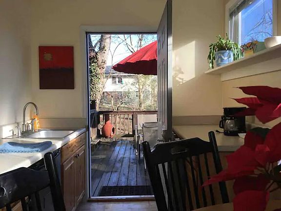 Cosy apartment downstairs at the Treehouse. Private access, bedroom, bathroom, living area and kitchenette (limited kitchen with only double hot-plate, microwave and small fridge. Private deck with woodland view with access to Kitchenette and living area. Shower bathroom with washing machine and dryer. Definitely no smokers! Smoking/Vaping is not allowed any where on the property. Landlord pays utility bills. Only one off-street parking space included.