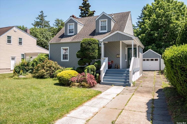 This is a lovely 2 Bedroom previously 3 Bedroom Cape located near major highways and walking distance to Farmingdale Village, home of many great restaurants, LIRR station and close location to famous Bethpage Black golf course, bike and walking trails. House was previously updated including, front entrance, kitchen, bath, deck, roof, plumbing, electric and siding. 2nd Floor Master Bedroom with Full Bath is spacious. Unfinished basement with high ceilings has great potential. Gas Stove and Dryer.