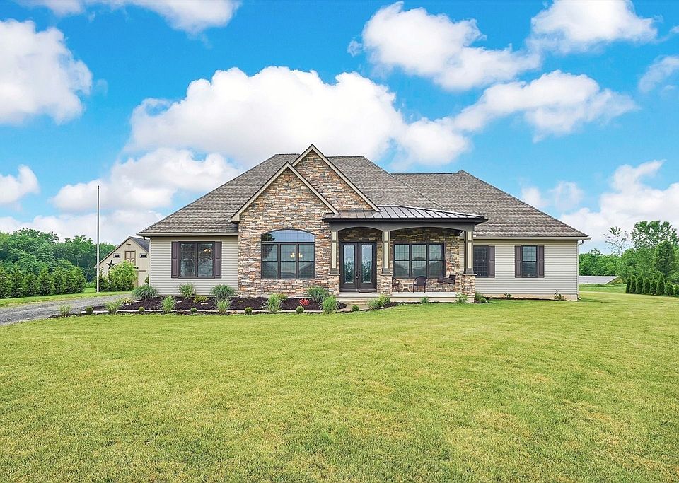 No detail was spared in the construction of this show-stopping sprawling Ranch. Upon entering, an airy foyer welcomes you into an open floor plan w/ 11 ft ceilings, decorative molding throughout & hardwood floors seamlessly connecting the kitchen, living & dining areas. The chef’s kitchen features 4 built-in wall ovens, 2 dishwashers, 6ft sub zero refrigerator, wine cooler, steam oven, heated floors & a hidden walk-in pantry. Four bedrooms in total, all designed w/ utmost privacy in mind & each offering walk-in closets & ensuite bathrooms w/ heated floors & toilet seats. The sublime master retreat features a sweeping walk-in closet w/ an abundance of custom cabinetry & resort-like bathroom w/ walk-in shower, jacuzzi tub & dual vanities. A bonus room offers guests a large & private place to stay w/ their own bathroom. This home is perfectly situated on 2 acres with gorgeous views from the front covered porch. Additional amenities; 3 car garage, central vac, high efficiency mechanicals.
