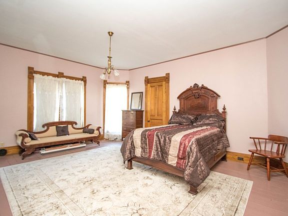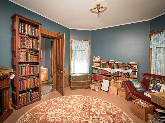 Woodwork from the outside in: crown molding, window and door trim, styled fireplace mantel, floor to ceiling buffet, multi-faceted roof with decorative trim, half wraparound covered porch, covered patio, 2 enclosed-heated porches. High ceilings and pocket doors really bring this Victorian home to life. 17 spacious rooms, 2 full baths, 5 bedrooms with 3 walk-in closets; one bedroom hosts the current library. Wet bar, large kitchen on 1st floor and 2nd kitchen on 2nd floor. 2 electric meters and 2-story carriage house has electric and large door for vehicle parking inside, large paved driveway.
