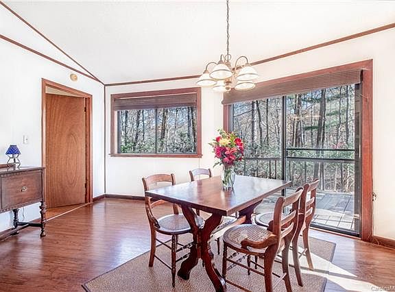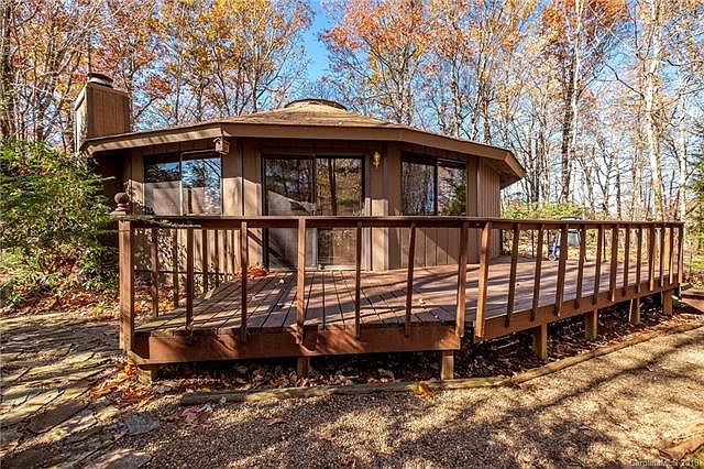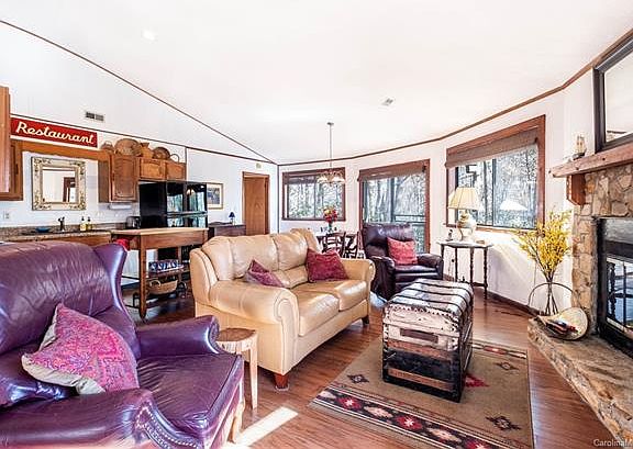 Impeccably maintained and updated 3 bed, 2 bath Deltec home on just under 1.5 acres! This home sits on a triple corner lot. The owners acquired three lots to provide privacy and and space for walking trails. The kitchen is open onto the living room which features a beautiful wood burning fireplace. The home has beautiful hardwood floors and vaulted ceilings throughout. The wrap around deck looks out into the wooded lot and is a great place to grill or take in a sunny day and read a book. This is the perfect private mountain cabin and it is only a few minutes from the clubhouse, pool, golf course and pickle ball and tennis courts. First time buyers pay $8000 amenity fee.