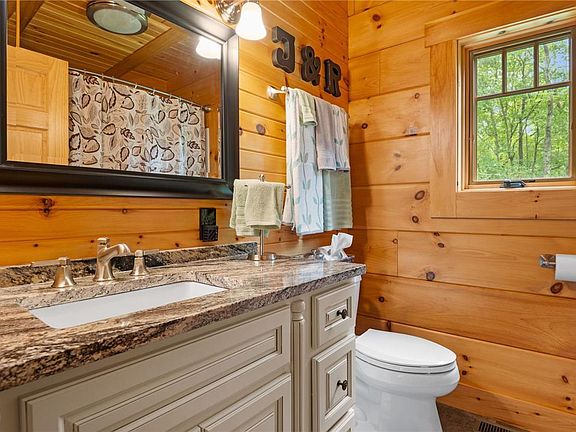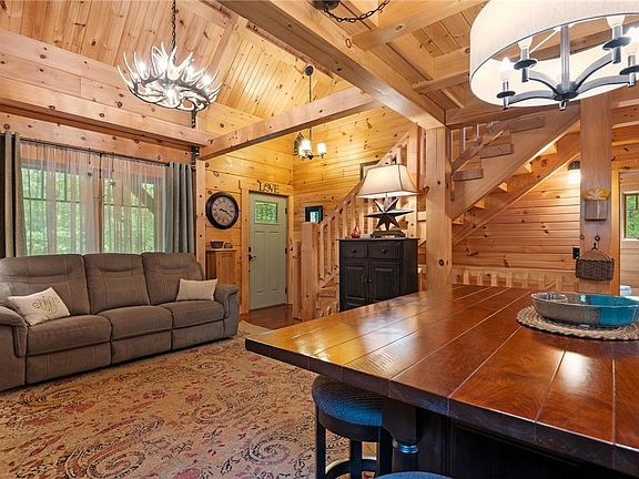CUSTOM designed TIMBERHAVEN LOG HOME on a combined 4.21 acres & detached garage with heat & A/C! MASSIVE 8x12 white pine logs with dovetail corners and purlin roof system encase this 2-3 bed/ 1.5 bath retreat. Stepping into this home you are surrounded with breathtaking tongue & groove pine covered walls & vaulted ceiling. First floor living room is open to the kitchen with maple cabinets & chestnut floors! Second floor is a spacious primary bedroom with a WIC and extra flex space for an office or sitting room. Family room or 3rd bedroom with kitchenette, half bath and laundry room are a bonus in the finished walk out basement! Forced air heat with A/C! Enjoy the outdoors on the screened in deck, covered porch or invite everyone over to party in the OAK & PEG constructed pavilion!